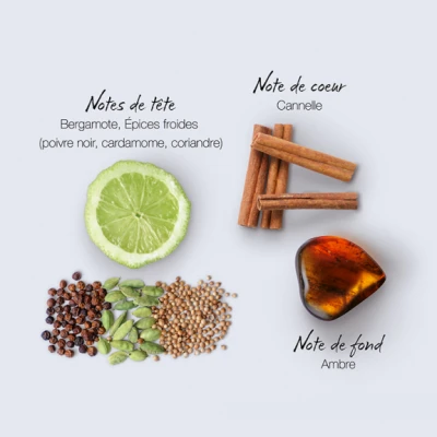 | Notes de Tête | bergamote, épices froides (poivre noir, cardamome, coriandre) |